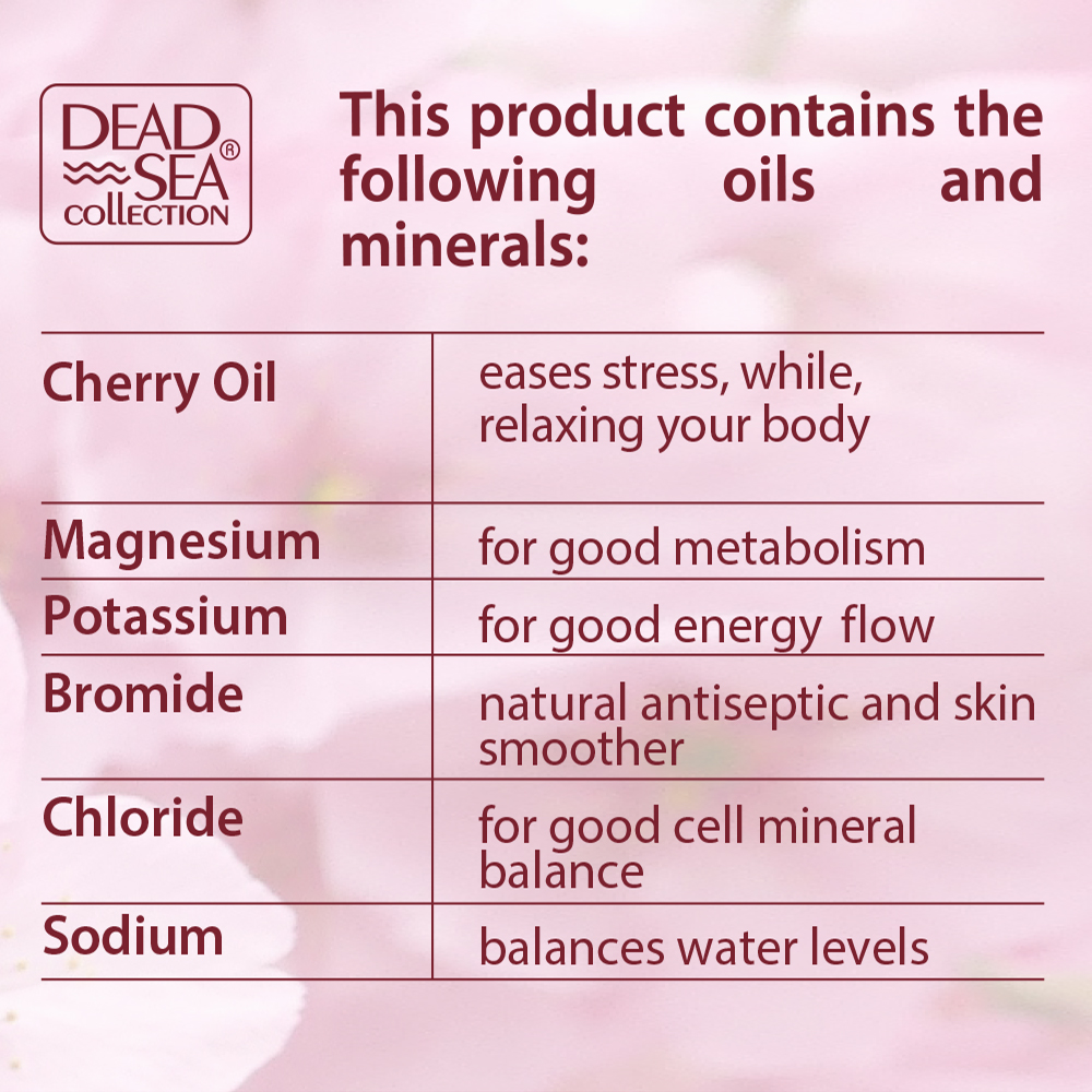 Нежный гель для душа с минералами Мертвого моря и экстрактом цветков вишни питает и защищает кожу восстанавливая её мягкость, бережно очищая от загрязнений, не высушивая кожу, оставляя нежный аромат. Для достижения оптимальных результатов мы рекомендуем использовать 100% натуральные соли для ванн Мертвого моря. Подходит для ежедневного использования, а также в качестве пены для ванн.