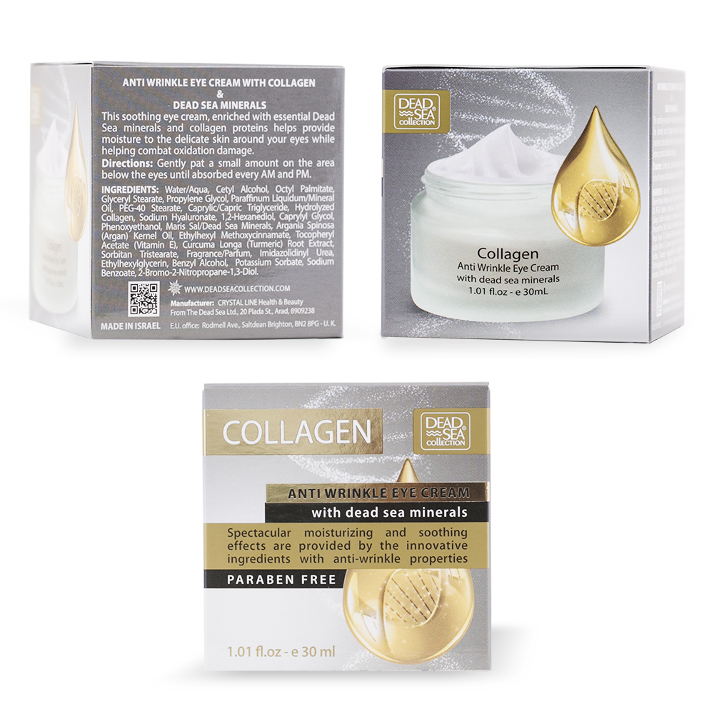 Крем от морщин для кожи вокруг глаз с коллагеном и натуральными минералами Мертвого моря не содержит парабенов. Обогащенный минералами Мертвого моря и коллагеном, крем помогает увлажнить нежную кожу вокруг глаз, одновременно помогая бороться с микро повреждениями кожи. Для достижения лучших результатов по уходу за кожей лица, рекомендуем использовать и другие продукты этой серии, дневной крем против морщин, ночной крем и сыворотку для лица с коллагеном.