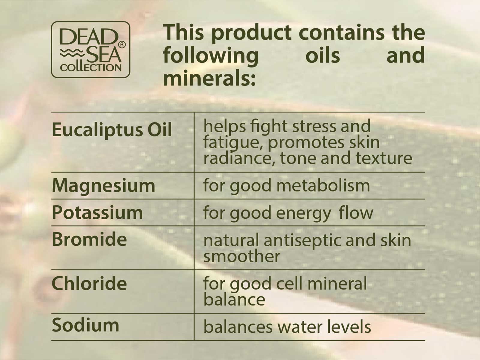 Соль для ванны с маслом эвкалипта. Этот продукт обогащен минералами Мёртвого моря и натуральным маслом эвкалипта. Такое сочетание будет питать вашу кожу минералами, помогая уменьшить мышечную усталость. Для комплексного СПА, мы рекомендуем использовать наши солевые скрабы. Подарите себе полный спектр спа-процедур, не выходя из собственного дома.