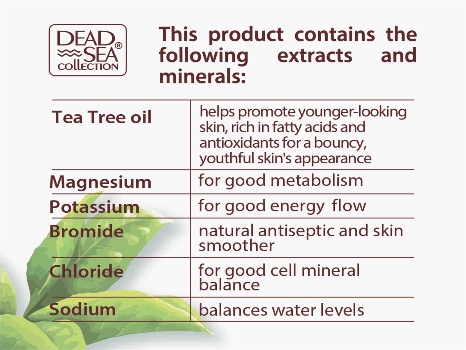 Сыворотка для лица из чайного дерева с натуральными минералами Мертвого моря не содержит парабенов. Интенсивная формула концентрированной сыворотки содержит питательные натуральные минералы Мёртвого моря и антиоксидантное масло чайного дерева, которые помогают сохранить кожу гладкой и молодой. Помогает увлажнить, защитить и укрепить кожу. Регулярное нанесение помогает бороться с последствиями стресса, солнца и загрязнения. Для достижения лучших результатов по уходу за кожей лица, используйте дневной крем, ночной крем и крем для кожи вокруг глаз с маслом чайного дерева. Принесите сокровища Мертвого моря в свой дом.